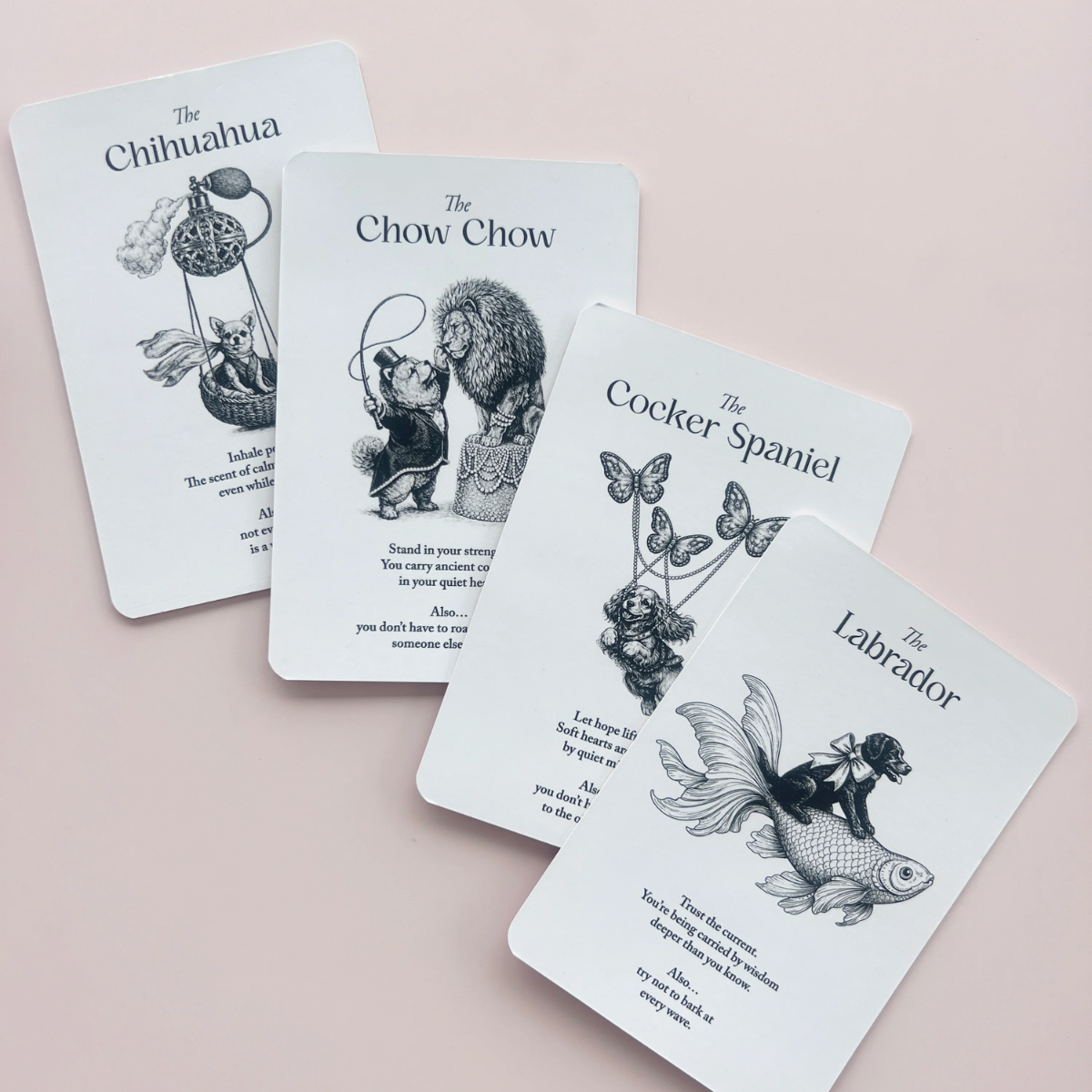 Her smelter hundens energi sammen med moderne spiritualitet i et smukt og gennemtænkt design. Hvert kort er illustreret med en unik hunderace og bærer sin egen symbolik og energi – fra loyalitet og styrke til intuition og følelsesmæssig balance.