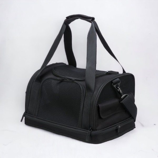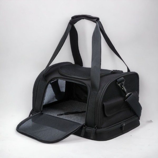The travel bag can be opened at the side, top and front. The bag has an outside pocket and an inside leash to secure your dog. The bottom plate is padded and waterproof and can be removed.