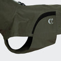 Soft and waterproof raincoat for French bulldogs in a timeless olive green color, made from 70% recycled materials.