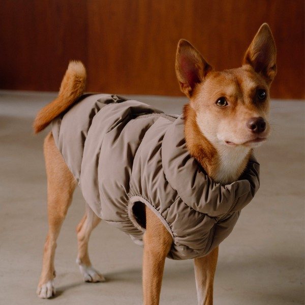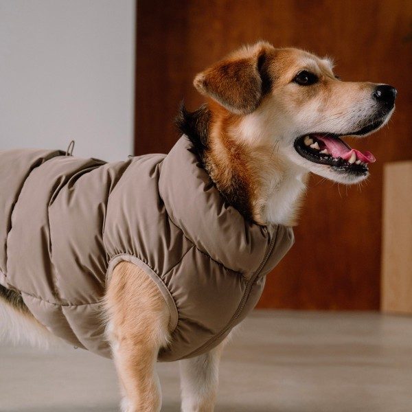 Water-repellent and thermally insulating jacket that does not need to be worn over your dog's head. The jacket simply needs to be worn over the back, around the front legs and then closed with a zipper on the stomach. The zipper has a rubberized head and integrated fabric to prevent it from getting caught in the fur. The entire jacket is made of recycled polyester, and the fit is made so that your dog can still play and frolic with it on. You can adjust the waist, collar and hem to ensure a snug, warm and insulating jacket. With a zipper on the back, your dog can easily wear a harness underneath.
