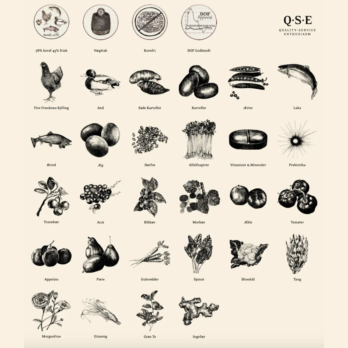 Fresh chicken & duck, dried chicken & duck, sweet potato, potato, peas, fresh salmon & trout, fresh whole eggs, flaxseed, alfalfa sprouts, liver stock, pea fiber, vitamins & minerals, MOS (mannan oligosaccarides), FOS (fructooligosaccharides), glucosamine, chondroitin, MSM (methylsulfonylmethane), cranberry, acai, blueberry, mulberry, apple, tomato, orange, pear, carrot, spinach, cauliflower, seaweed, marigold, ginseng, green tea, ginger.