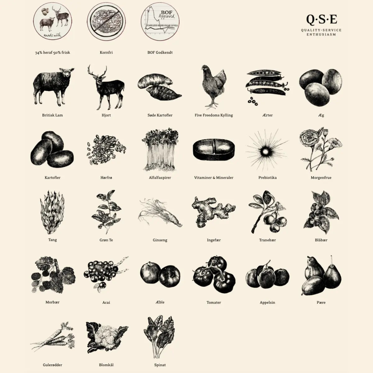 Fresh lamb & venison, sweet potato, dried lamb, peas, fresh whole eggs, dried chicken, potato, flaxseed, lamb fat, alfalfa sprouts, liver stock, vitamins & minerals, MOS (mannan oligosaccarides), FOS (fructooligosaccharides), glucosamine, chondroitin, MSM (methylsulfonylmethane), cranberry, acai, blueberry, mulberry, apple, tomato, orange, pear, carrot, spinach, cauliflower, seaweed, marigold, ginseng, green tea, ginger.