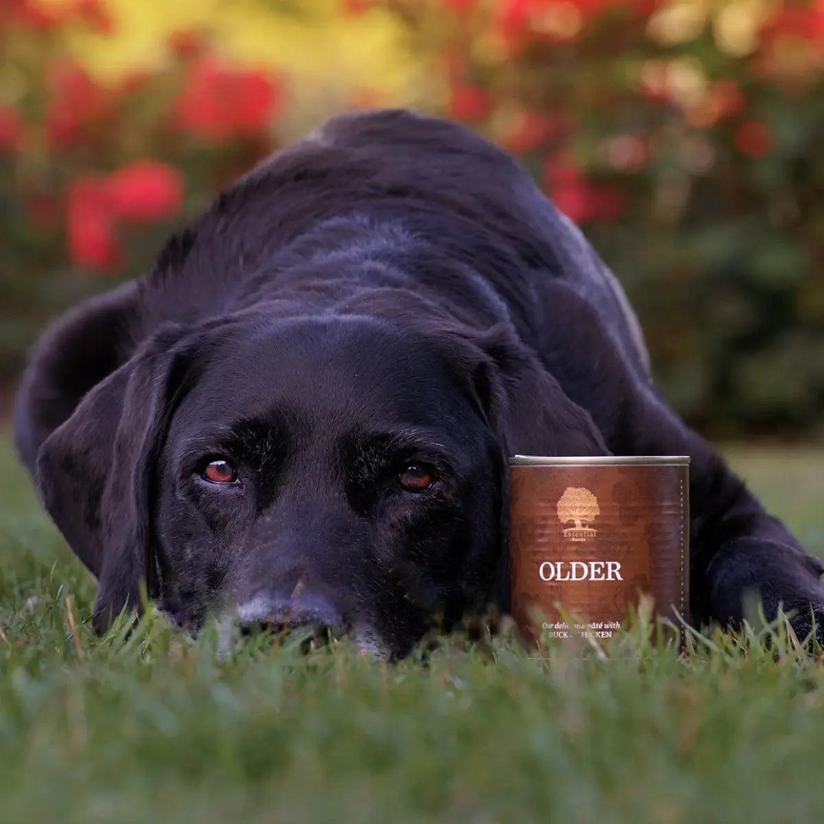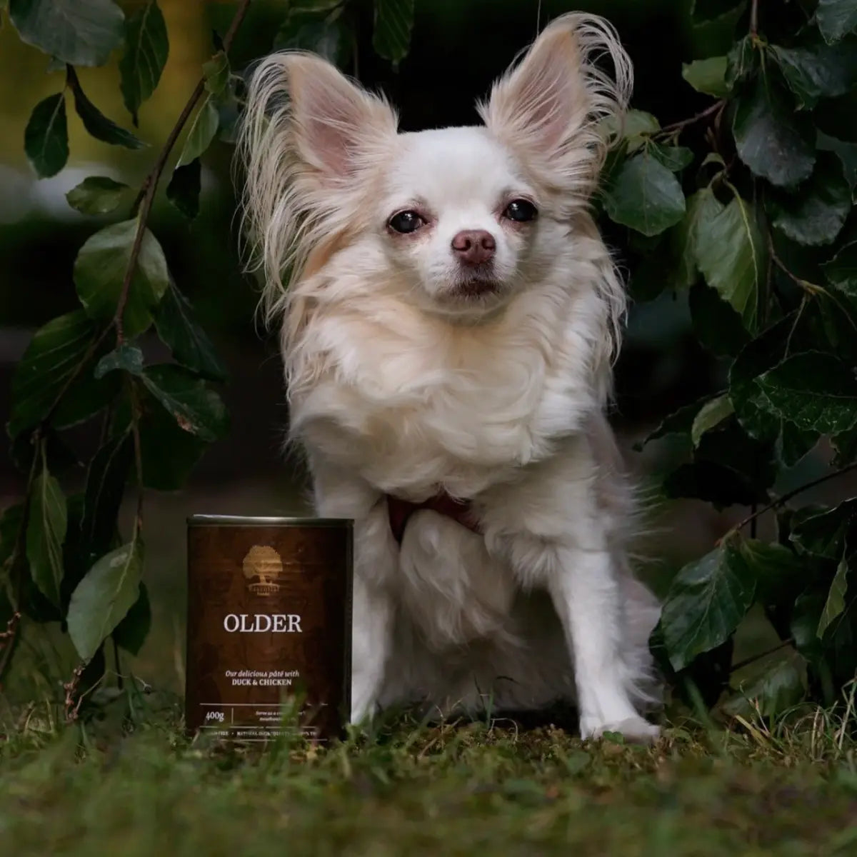 Older pâté is a delicious pâté with duck and chicken meat chunks, tailored to the needs of older dogs. It can be served as a complete food or as a tasty topping that supports gentle digestion - something seniors often appreciate.