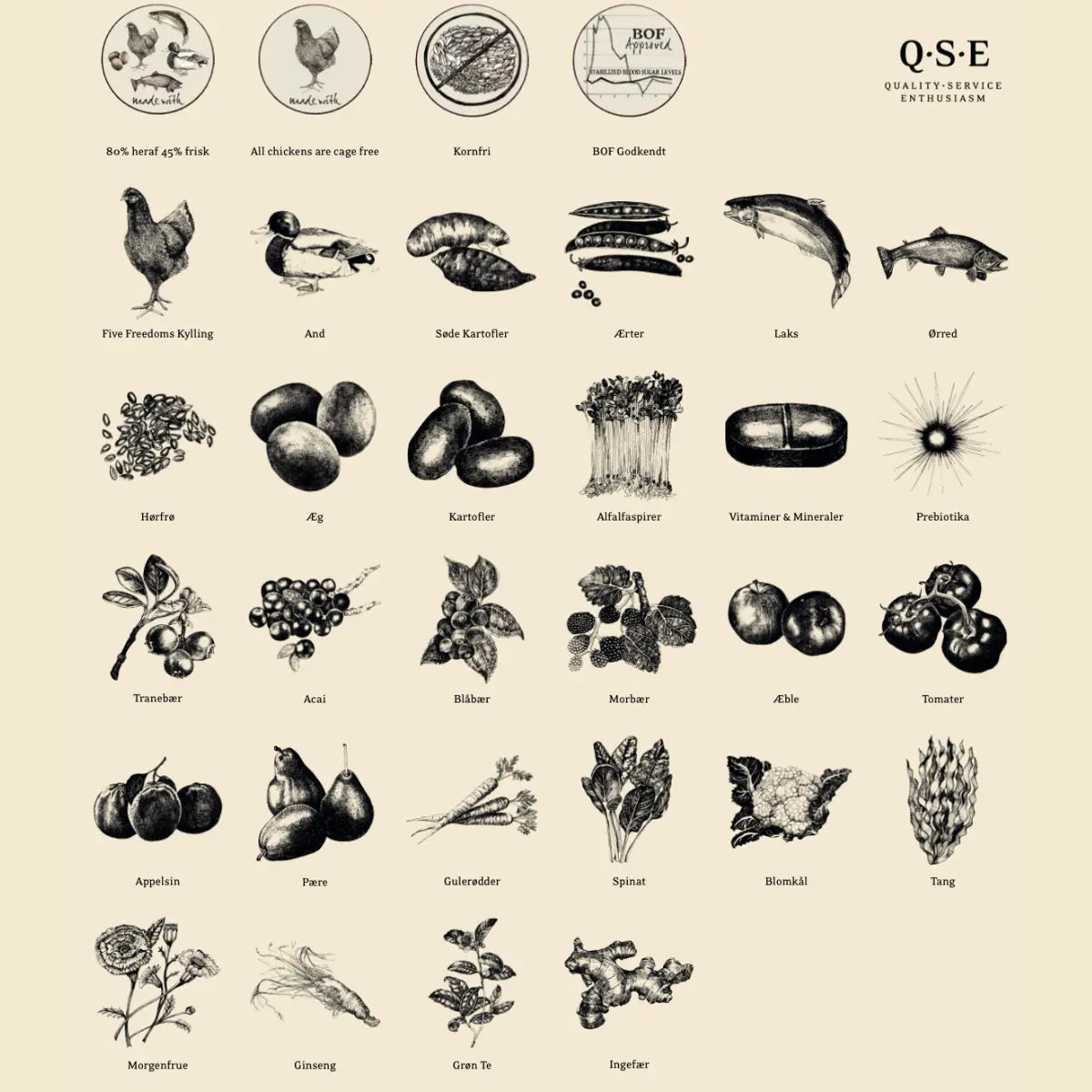 Freshly prepared chicken & duck, dried chicken & duck, sweet potato, peas, freshly prepared salmon & trout, flaxseed, whole eggs, chicken fat, potato, liver stock, alfalfa, vitamins & minerals, MOS (mannan oligosaccarides), FOS (fructooligosaccharides), glucosamine, chondroitin, cranberry, acai, European blueberries, mulberries, apple, tomato, orange, pear, carrot, spinach, cauliflower, seaweed, marigold, ginseng, green tea, ginger.