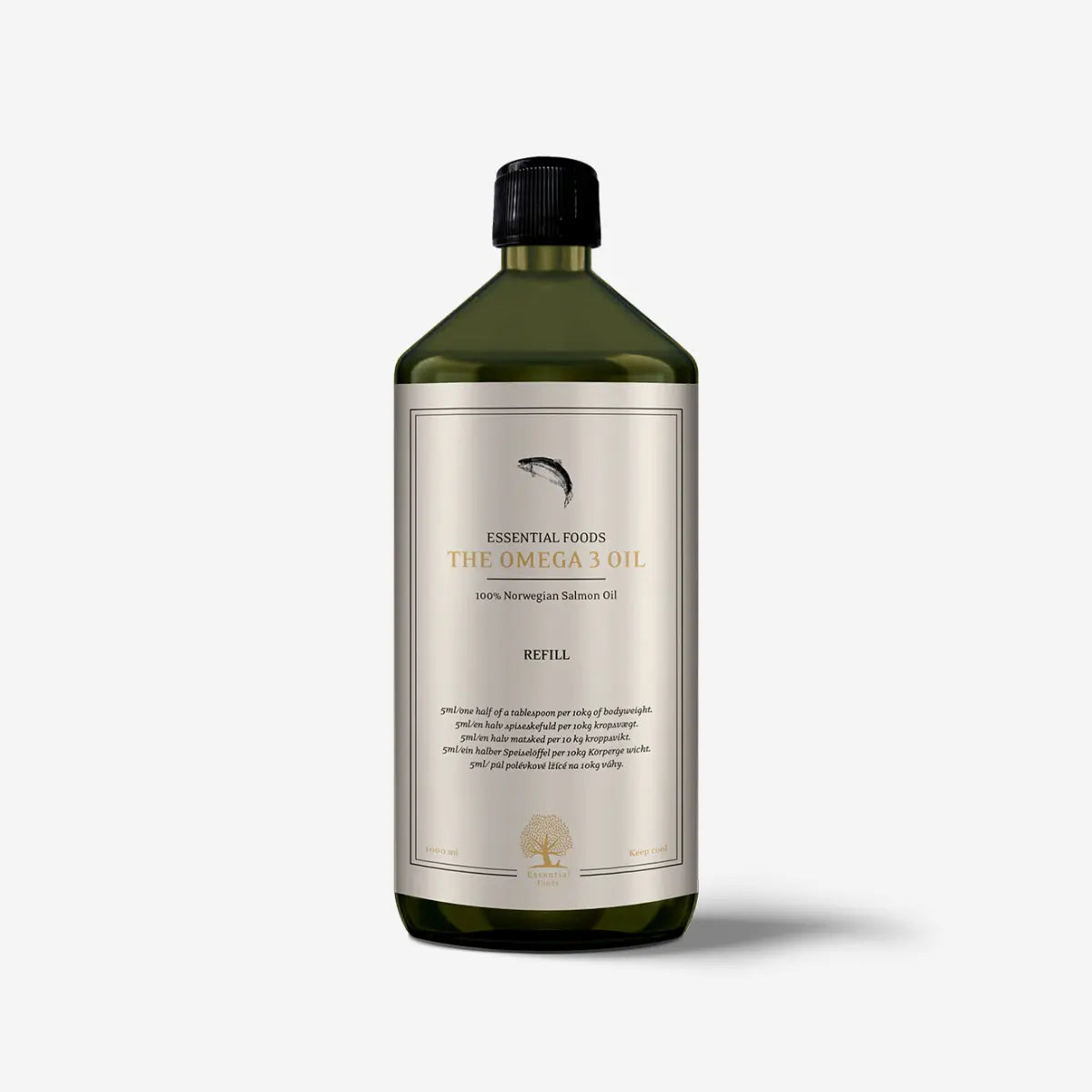 Cold-pressed salmon oil from 100% Norwegian salmon - This variant contains 1000 ml in a plastic bottle and can either be purchased alone or used as a refill for the 500 ml variant in a glass bottle.
