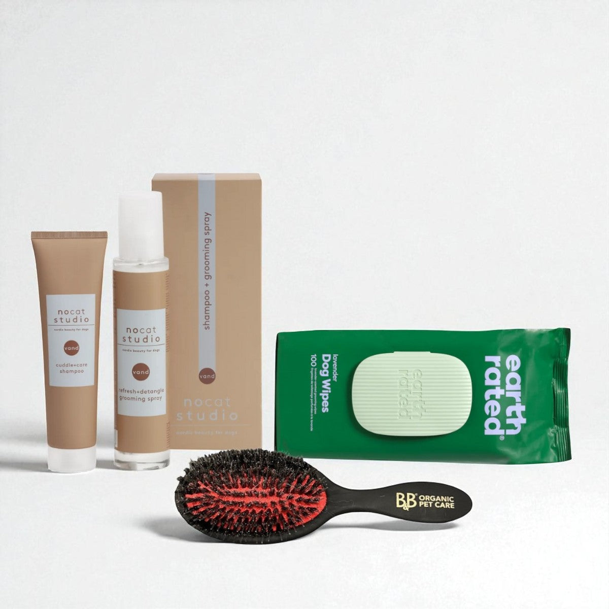 The package includes a shampoo and conditioner set from Nocat Studio, which provides a gentle and nourishing wash, as well as soft lavender wet wipes from Earth Rated - ideal for quick cleaning of paws and fur in everyday life. In addition, there is B&B's favorite brush, which is especially gentle and gives a beautiful shine to the fur.
