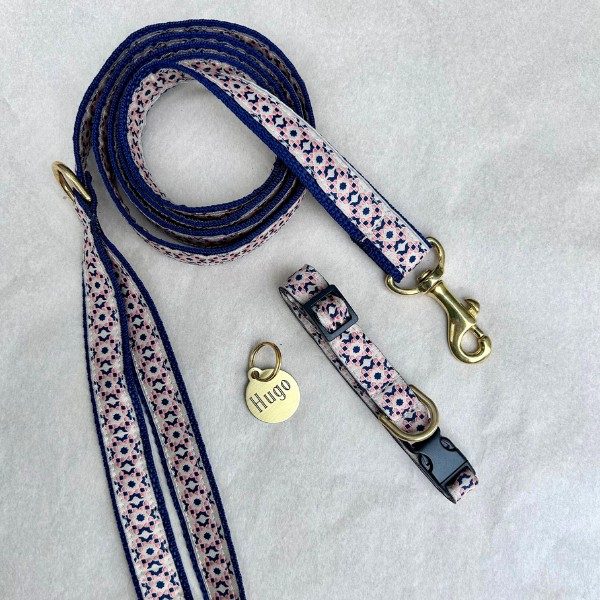 The collar is 1.5 cm wide and can be adjusted from 21-34 cm. The leash measures 140 cm and is 2 cm wide. Suitable for puppies and dogs under 6 kg.