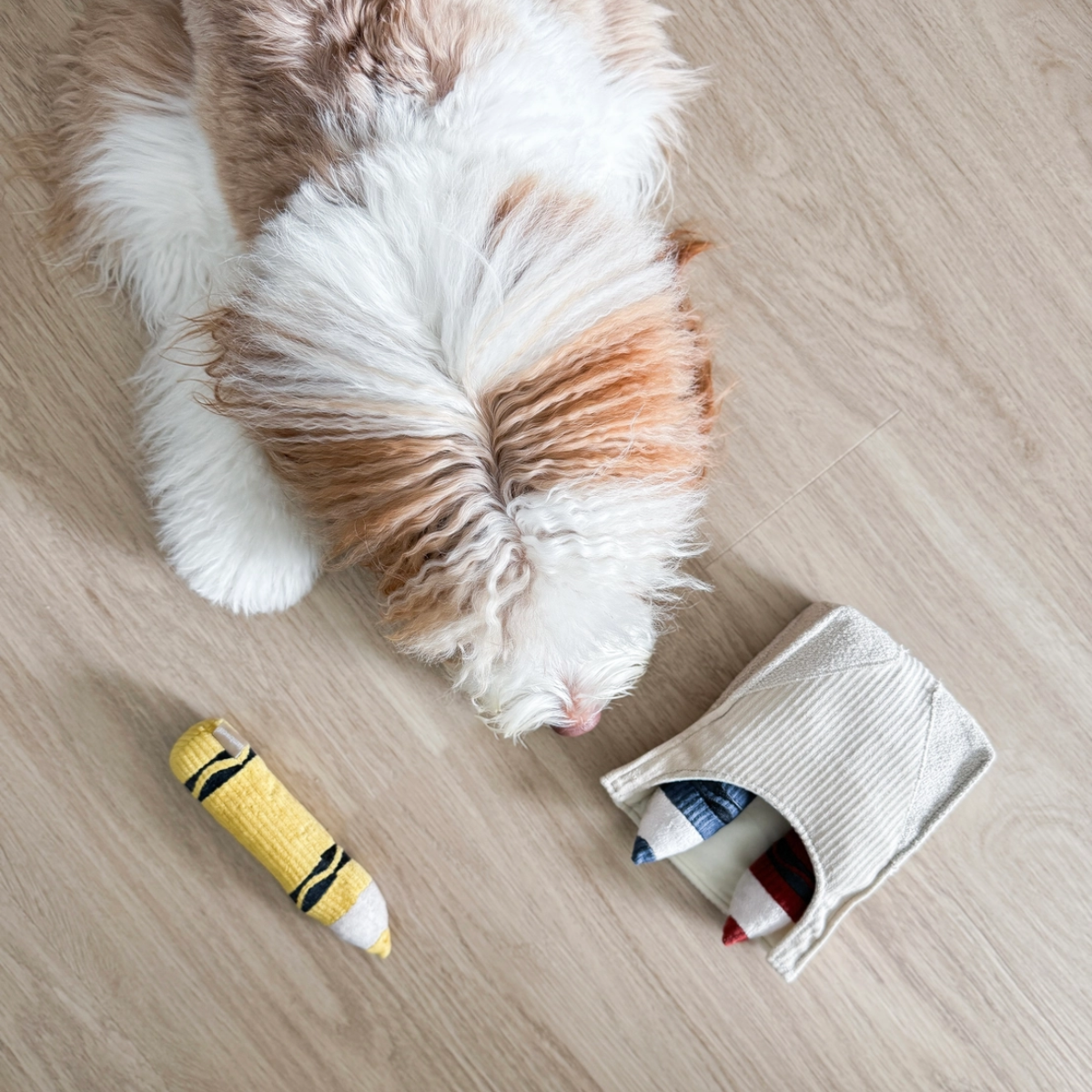 Hvem siger, at hunde ikke kan skrive og tegne? Med disse farverige farveblyanter bliver snuseleg både sjovt og udfordrende. Du kan gemme godbidder i æsken og fylde den med de bløde farveblyanter, så din hund får en sjov opgave med at snuse og grave dem frem. Blyanterne har piv i sig og giver masser af variation i legen.