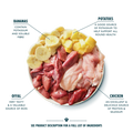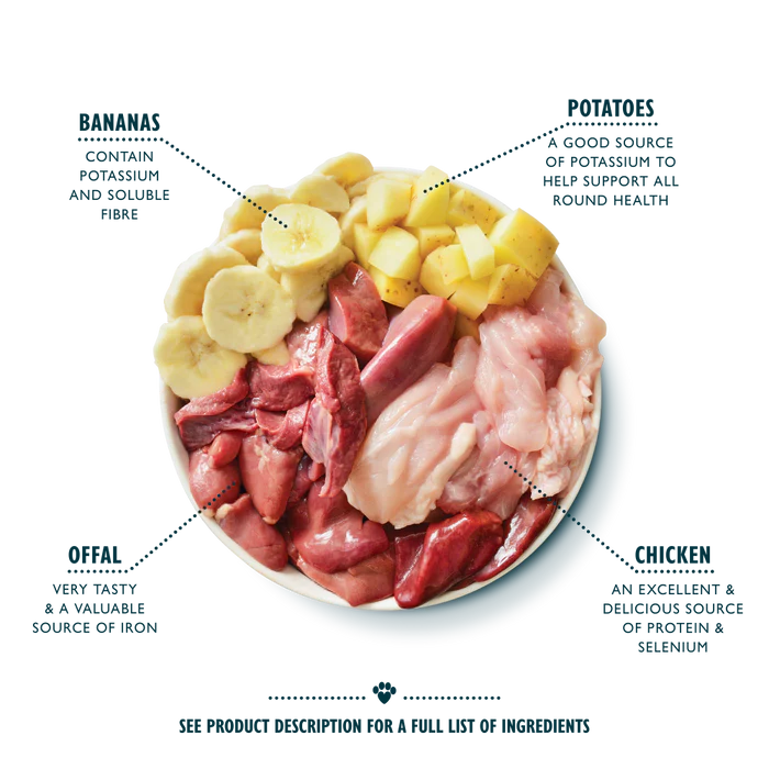 Frisk kylling 50%, kartoffel 11%, banan 9%, mineraler, FOS (0,1%), MOS (0,1%)