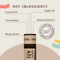 Remaining essential ingredients: coconut oil, candelilla wax, natural vitamin E, chamomile, mango butter, cocoa butter, chamomile