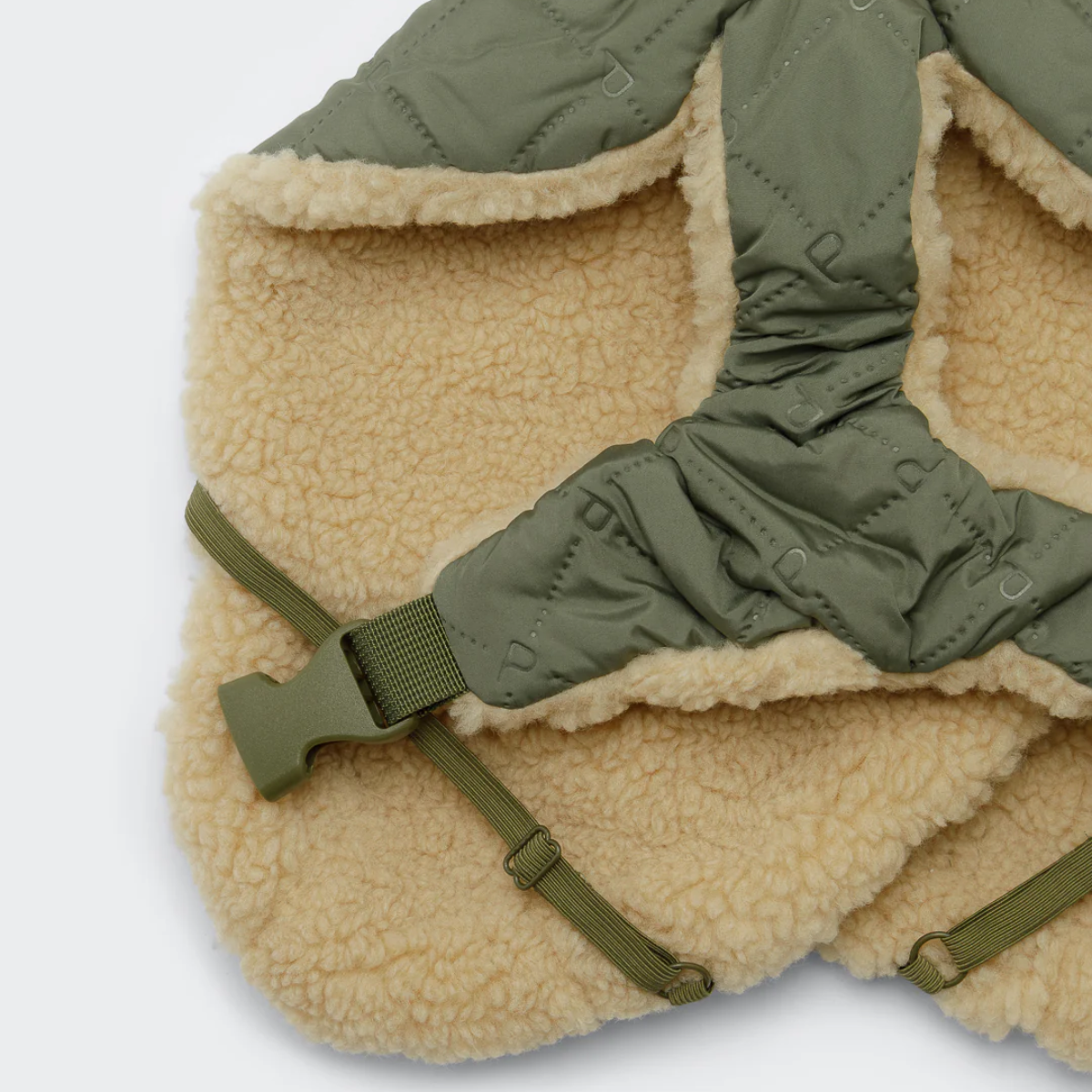 En varm og vendbarvinterjakke til hunde med laserskåret quilt på den ene side og blød sherpa på den anden. Jakken er lavet af genanvendte materialer og kan tilpasses efter din hunds pasform med justerbare stropper. En praktisk åbning til selen gør det nemt at fastgøre linen, uanset hvilken side du bruger.