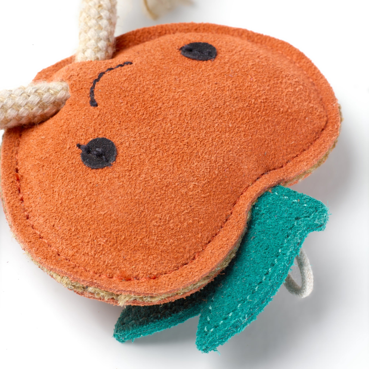 Denne friske lille satsuma mandarin bringer masser af sikker leg til din hund Den er lavet af 100 % naturlig jute og beklædt med blødt ruskind, så den er helt sikker at tygge i, samtidig med at den er let for små snuder at gribe og lege træklege med. Perfekt til mindre hunde, der elsker sjovt legetøj med god bidemodstand.