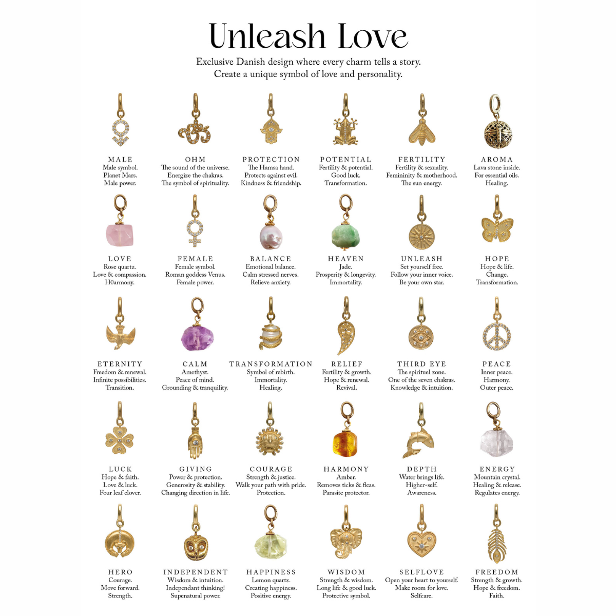 Kollektionen er designet til at styrke og fordybe forbindelsen mellem dig og dem omkring dig, og hvert vedhæng bærer en intention, der kan mærkes. Alle elementer kan mikses, matches og kombineres, så du kan skabe et personligt udtryk, der fortæller din helt egen historie