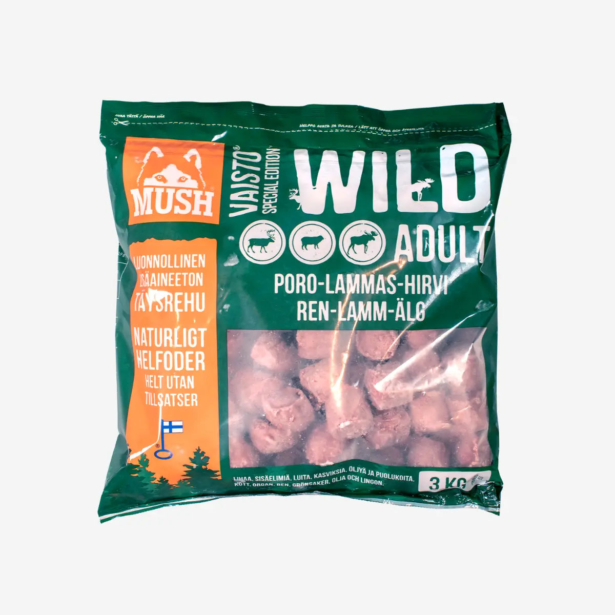 Mush Vaisto Wild (reindeer-lamb-elk) is a complete food for adult dogs. All variants have meat, bones and organs from 3 different animals, which ensures variety and different amino acids and minerals.