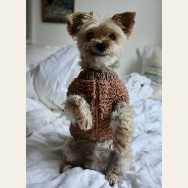 Teddy Vest Woolly edition with zipper is a lovely, soft vest for dogs knitted in fluffy bouclé yarn with ribbed edges knitted in wool yarn. The zipper is mounted with a coating on the inside. The vest has a double neck edge in rib knitted on 3 mm needles, from here you continue to knit back and forth in bouclé yarn on 5 mm needles (60 cm) in stocking stitch. The yarn is fluffy and thick to knit in, and due to the structure it is difficult to both see and count stitches and to correct mistakes. Therefore, be aware at all times that you have all the stitches on the needle, so that there is not suddenly a runner in the middle of your work. The difficulty level of the pattern is rated as 5/5.