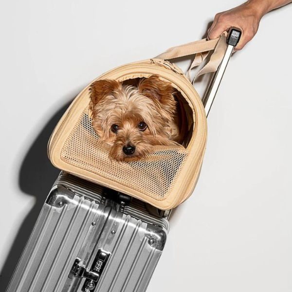 A minimalist and beautiful travel bag for the small dog that is going on a trip. But it is not only beautiful, but also functional. The mesh material ensures that your dog gets plenty of fresh air. The travel bag can be opened at the top via double zippers and has handles and a long shoulder strap. The flight bag can also be attached to the handle of your rolling suitcase using a practical pocket.