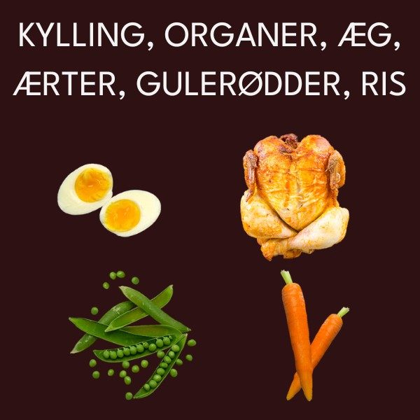 Ingredients: chicken (59%) (meat, skin, organs), rice, carrot, peas, eggs, water, vitamins and minerals