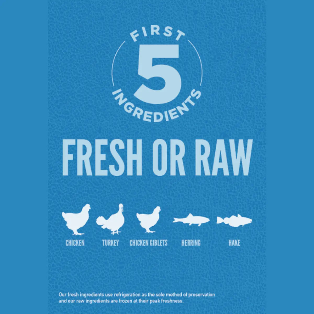 Fresh chicken (13%), fresh turkey (7%), fresh whole eggs (7%), fresh chicken liver (6%), fresh whole herring (6%), fresh whole halibut (5%), fresh turkey liver (5%), fresh chicken neck (4%), fresh chicken heart (4%), fresh turkey heart (4%), chicken (dehydrated, 4%), turkey (dehydrated, 4%), whole mackerel (dehydrated, 4%), whole sardine (dehydrated, 4%), whole herring (dehydrated, 4%), whole red lentils, whole green lentils, whole green peas, lentil fiber, whole chickpeas, whole yellow peas, whole pinto beans, whole white beans, herring oil (1%), chicken fat (1%), chicken cartilage (1%), chicken liver (freeze dried), turkey liver (freeze dried), fresh whole pumpkin, fresh whole almond pumpkin, fresh whole zucchini, fresh whole parsnip, fresh whole parsnip, fresh carrots, fresh whole Red Delicious apples, fresh whole Bartlett pears, fresh garden cabbage, fresh spinach, fresh beets, fresh turnips, fresh turnips, brown seaweed, fresh cranberries, fresh whole blueberries, fresh Elderberry, fresh Elderberry, chicory root, turmeric, dandelion, dandelion, burdock root, lavender, hollyhock, rose hips. ADDITIVES (per kg): Nutritional additives: Zinc chelate: 100mg. Preserved naturally with vitamin E. Zootechnical additives: Enterococcus faecium
