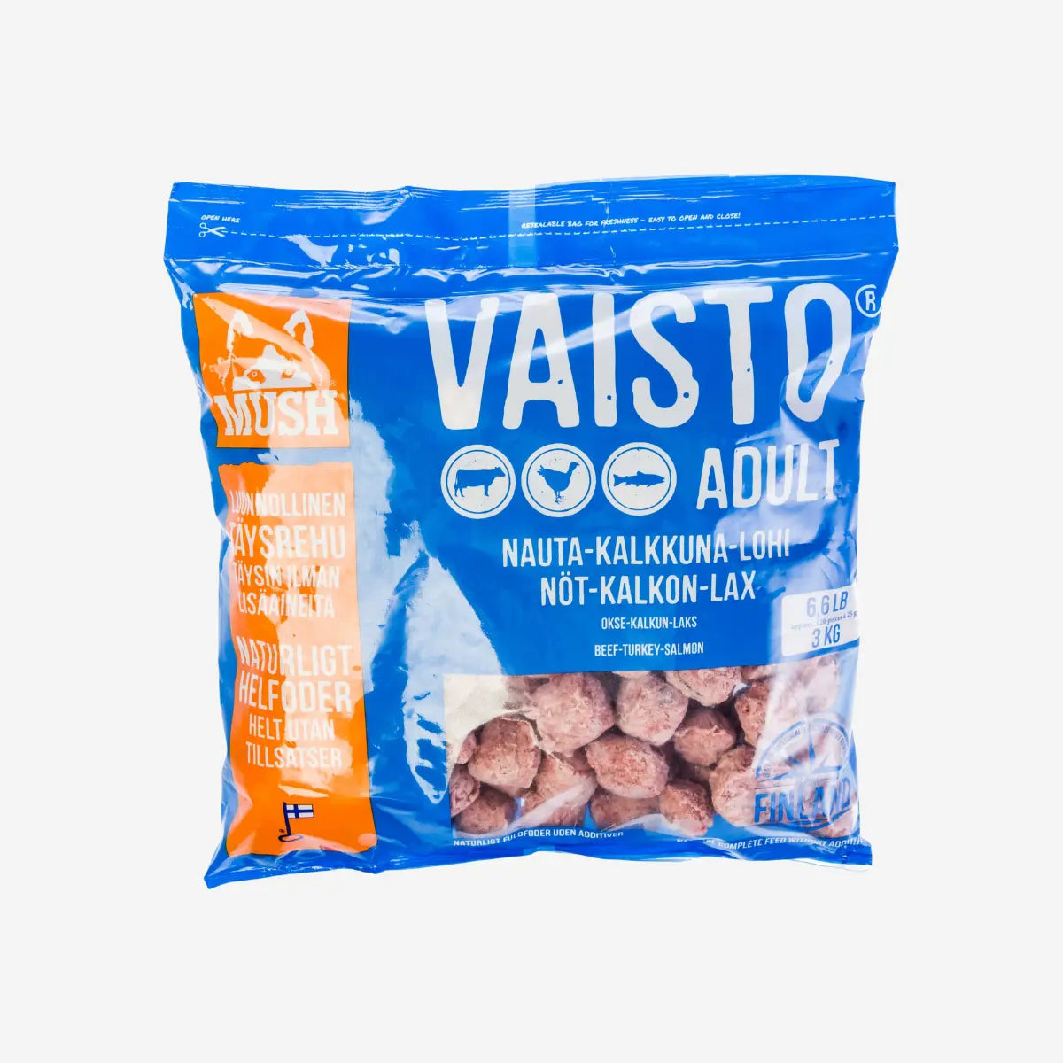 MUSH Vaisto blue (beef-turkey-salmon) is a complete food for adult dogs. MUSH Vaisto® blue is designed for all adult dogs, but is especially suitable for dogs with skin and/or coat problems. All variants have meat, bones and organs from 3 different animals, which ensures variety and different amino acids and minerals.
